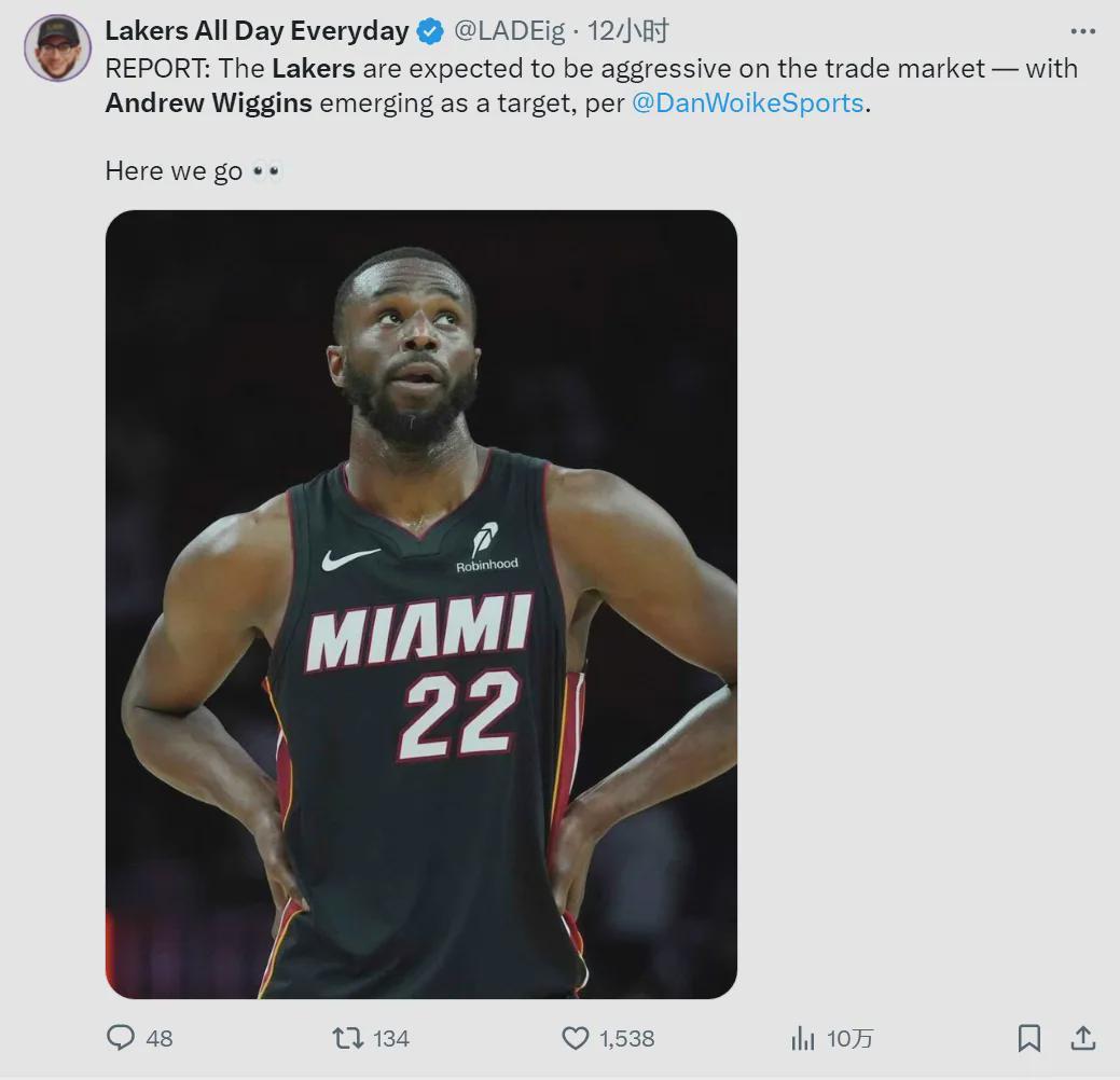今年7月份,自由市场开启之后,湖人跟热火探讨维金斯的交易。当时热火要价太高,吓退湖人。今年8月3日,湖人3年1.65亿美元提前续约东契奇,合同延长至2029年夏天。东契奇需要搭档有防守能力的锋线,所以湖人又来追维金斯。
